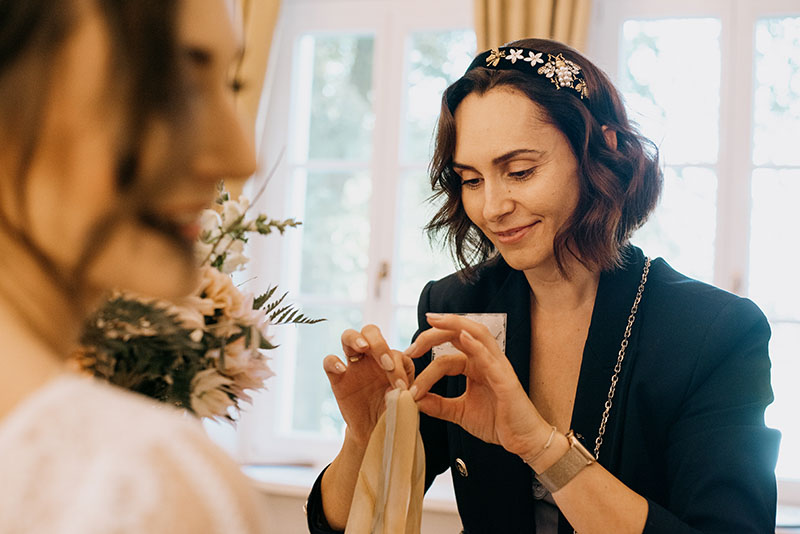 Jeśli chodzi o naszą Pannę Młodą, o jej make-up zadbała Paulina (Gai Make-up). Był on bardzo naturalny, nieprzerysowany, perfekcyjnie dopasowany do nietuzinkowej urody i charakteru Agaty. Z włosami zbędne były wszelkie szaleństwa, dlatego stylistka upięła je w ozdobny, lecz delikatny koczek u dołu głowy. Agata wystąpiła w klasycznej, nobliwej sukni od OCHOCKA Atelier, która tylko podkreśliła jej niezwykłe piękno.